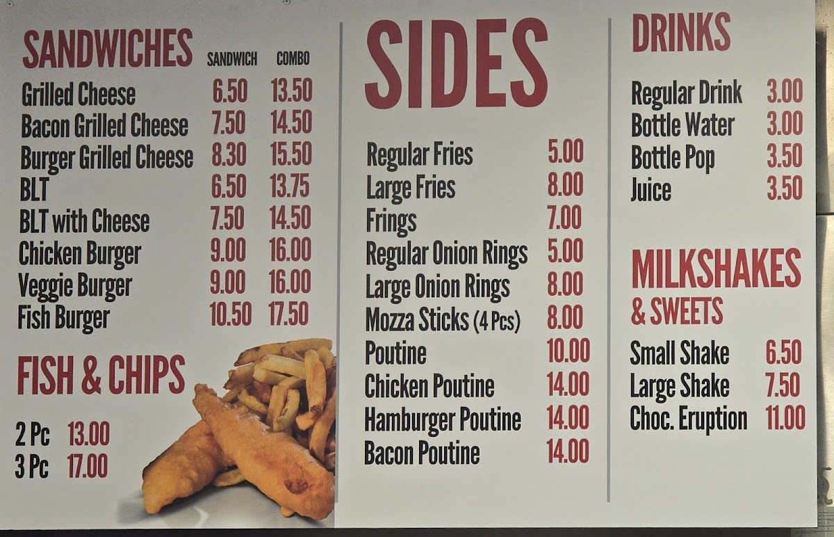 Grilled cheese paired with choice of large fries, onion rings, poutine, or regular fries. Drink options include bottled 7-Up, Mountain Dew, iced tea, or orange juice.