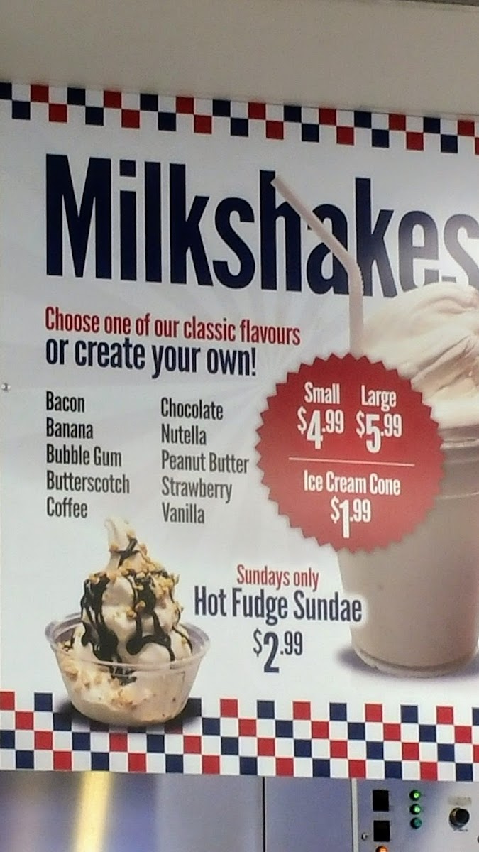 Little bacon cheeseburger paired with choice of cheddar, mozzarella, or Swiss. Pick from fries, onion rings, or poutine. Beverages include soda options and orange juice.