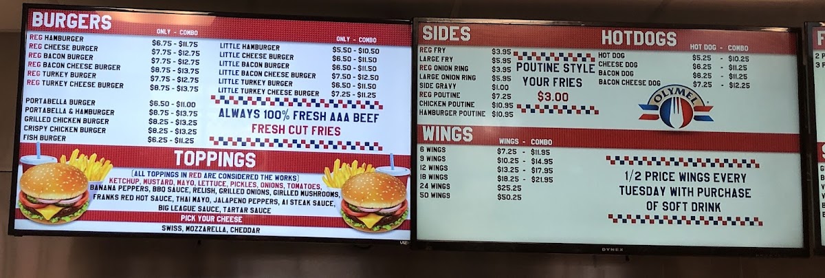 Veggie burger topped with choice of cheddar, mozzarella, or swiss; sides include large or regular fries, onion rings, poutine; drinks range from iced tea, Mountain Dew, orange juice.
